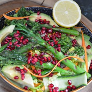 This delicious salad is a perfect side for BBQs as the broccoli can be slightly charred on the grill adding some extra flavour. The bitterness of the broccoli goes fantastically well with the sweet sharpness of the pomegranate gems. The Lemon dressing finishes it nicely. I love how healthy all the ingredients are, they are bursting with nutrition and goodness!